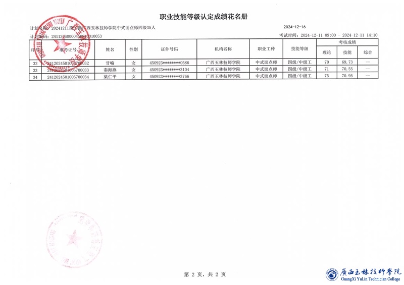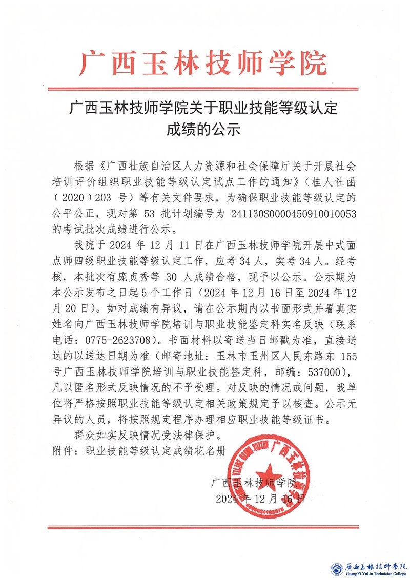 职业技能等级认定成绩公示(计划编号:241130S0000450910010053)