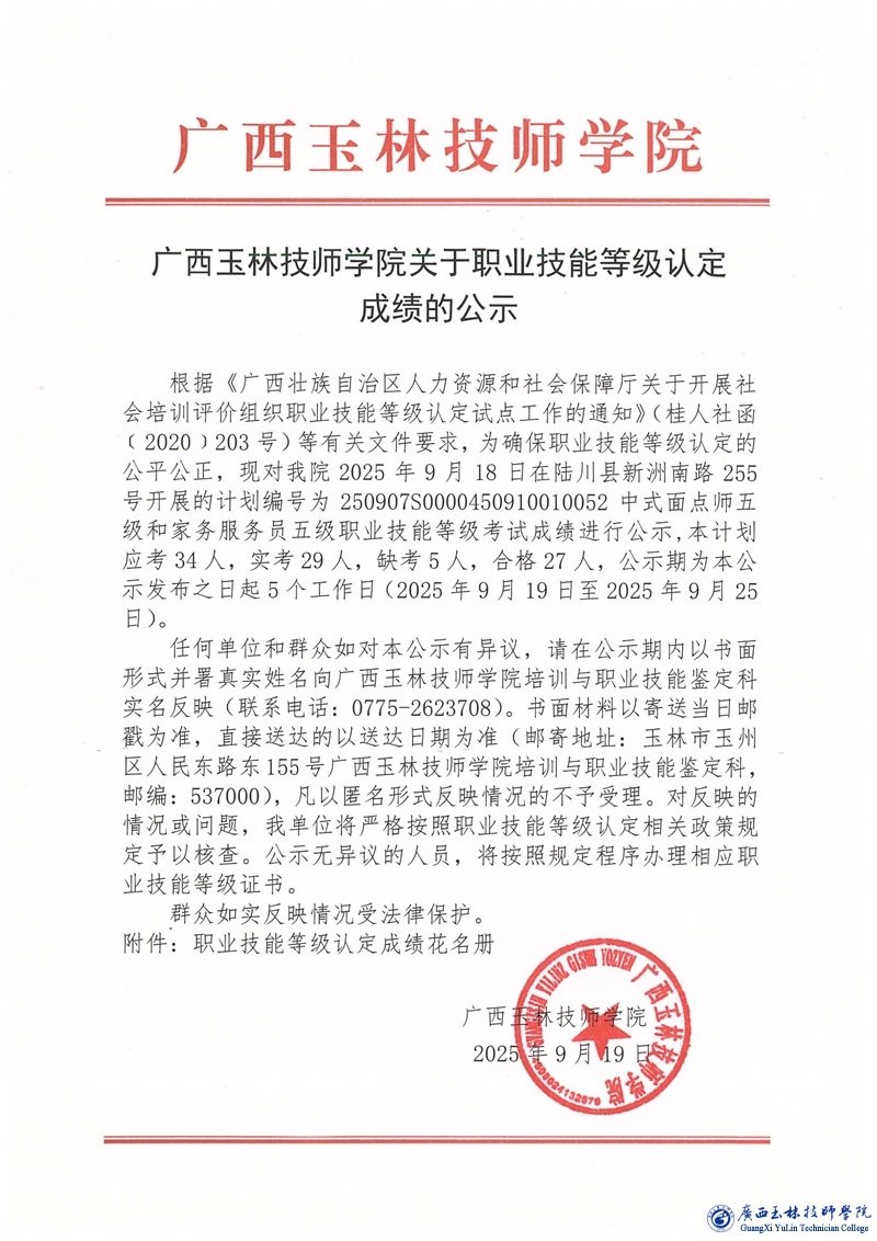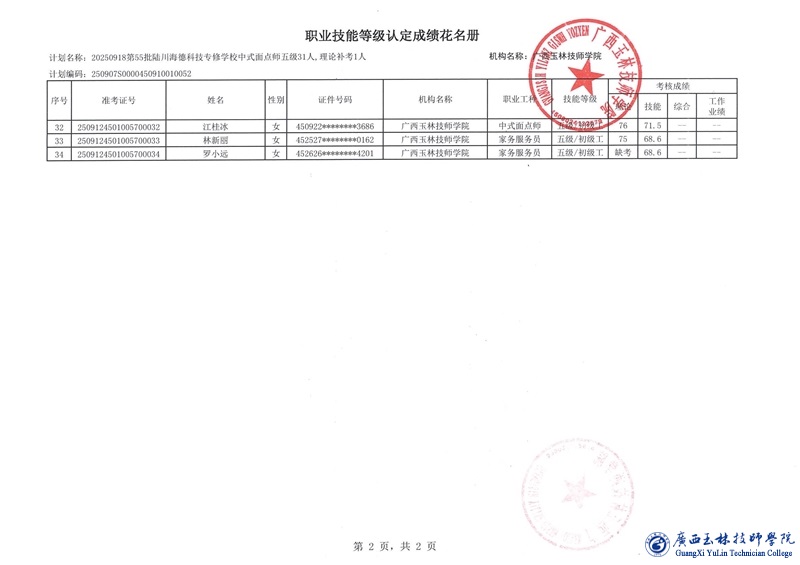职业技能等级认定成绩公示(计划编号:250907S0000450910010052)