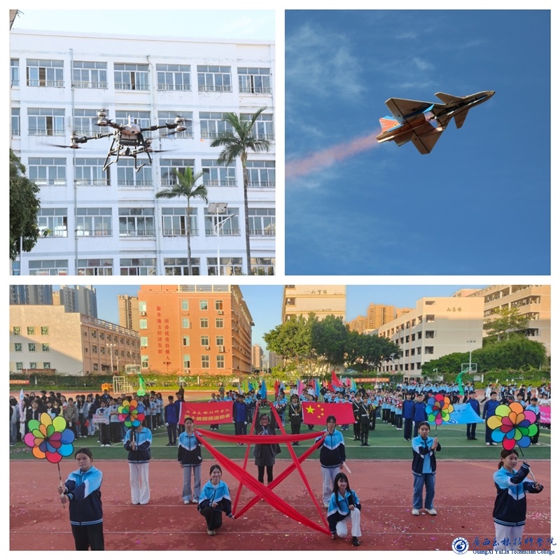随着党委书记辛相宁同志铿锵宣布“广西玉林技师学院第十届田径运动会正式开幕”,无人机腾空而起,在蓝天中绽放出绚丽花雨,全场欢呼。这一科技与浪漫交融的瞬间,既象征着学院对学子成长成才的殷切期许,也标志着体育盛会正式进入竞技阶段。