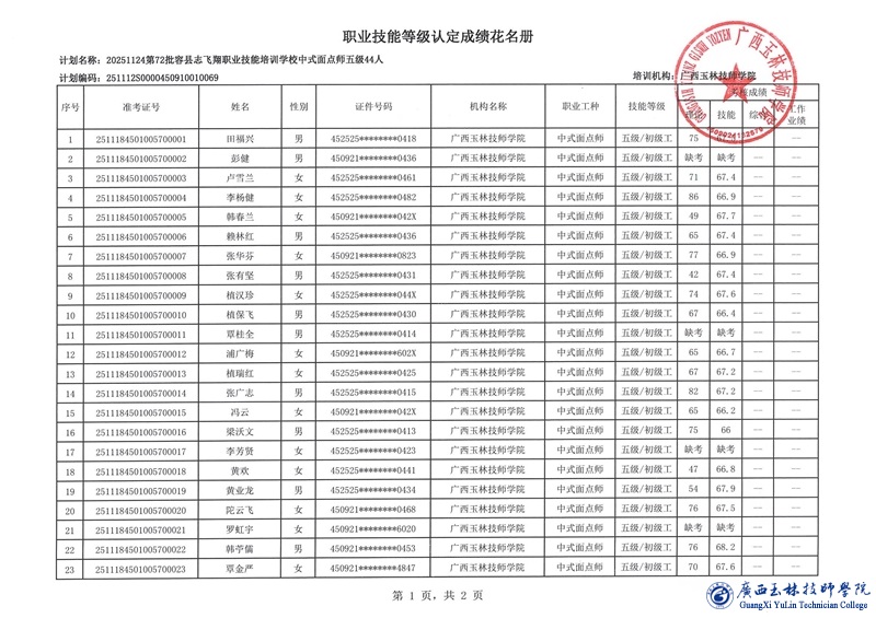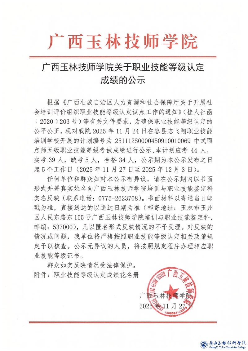 职业技能等级认定成绩公示(计划编号251112S0000450910010069)
