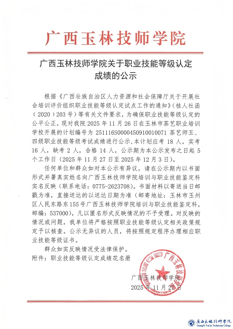 职业技能等级认定成绩公示(计划编号251020S0000450910010064)