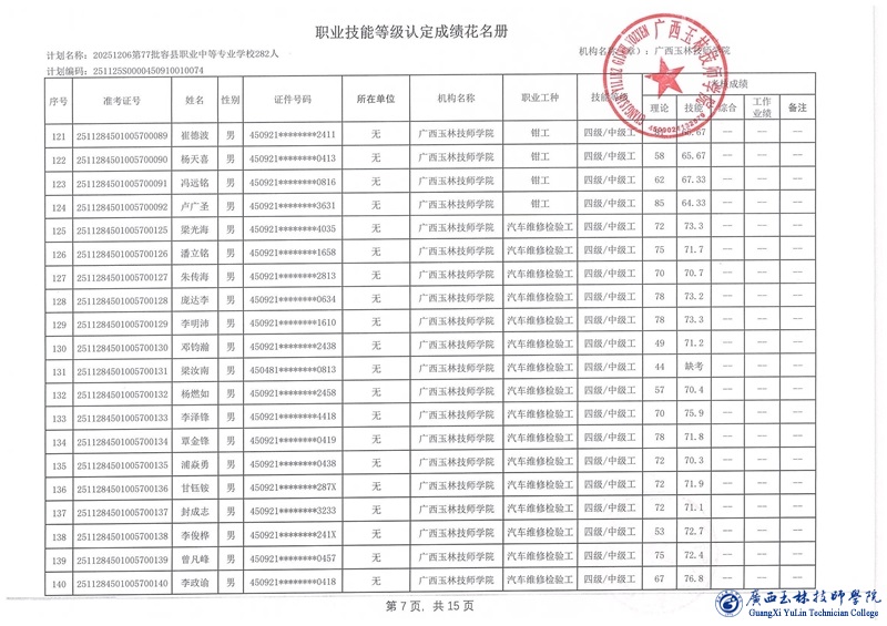 广西玉林技师学院关于职业技能等级认定成绩的公示(计划编号:251125S0000450910010074)