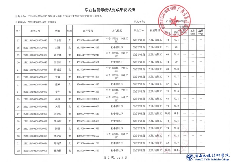 广西玉林技师学院关于职业技能等级认定成绩的公示(计划编号:251214S0000450910010087)
