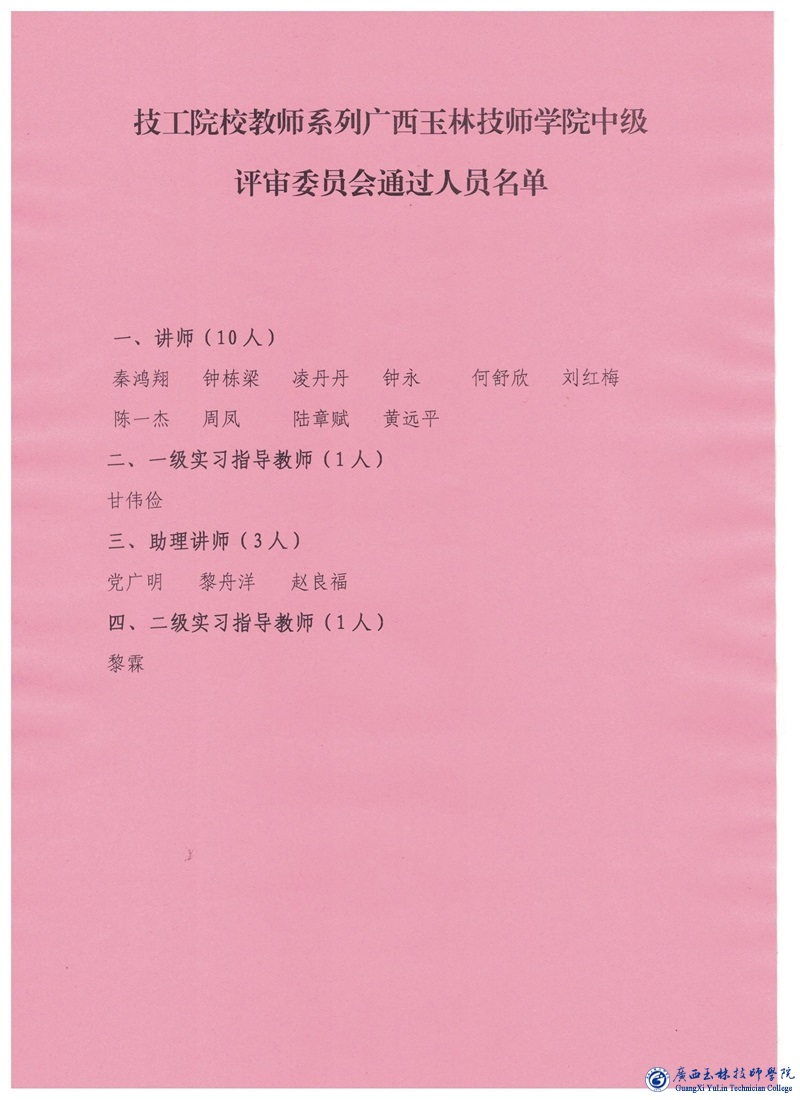 2025年广西玉林技师学院中初级职称评审通过人员名单公示