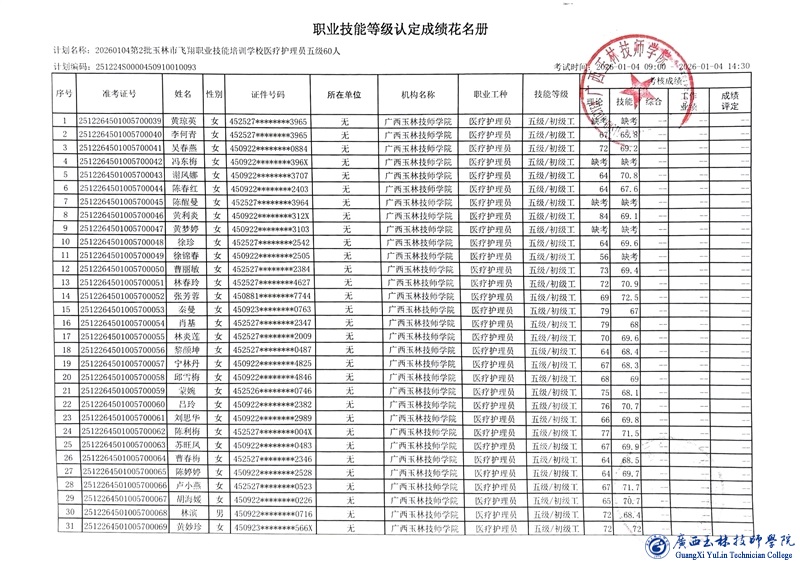 广西玉林技师学院关于职业技能等级认定成绩的公示(计划编号:251224S0000450910010093)
