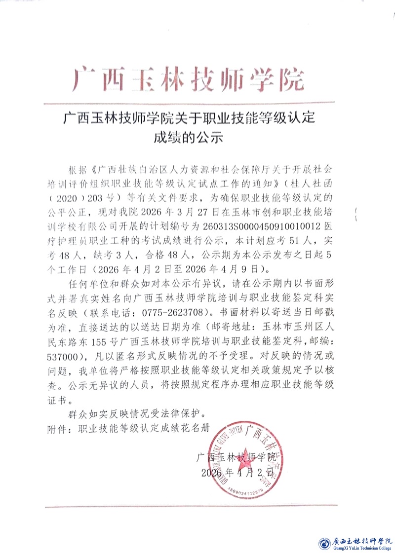 职业技能等级认定成绩公示(计划编号:260313S0000450910010012)