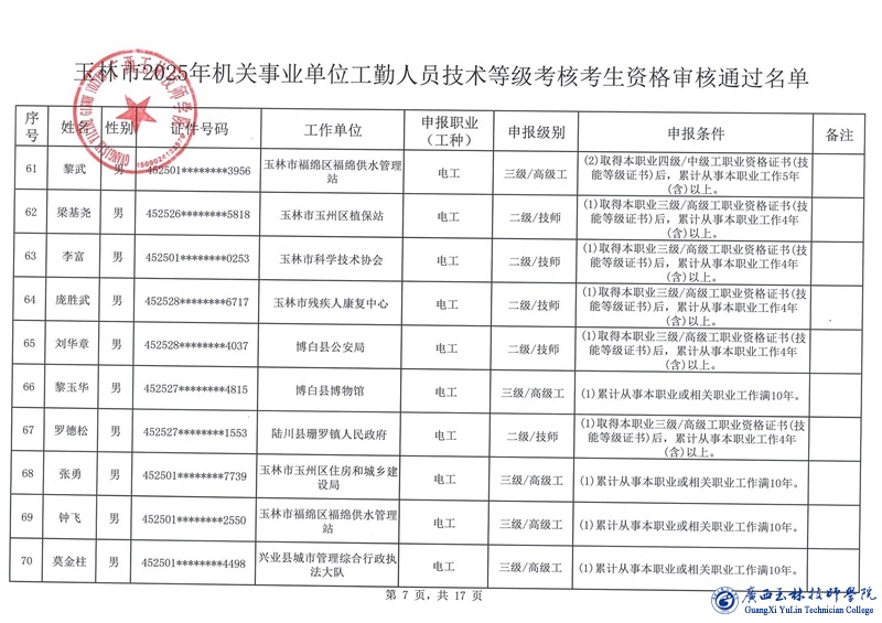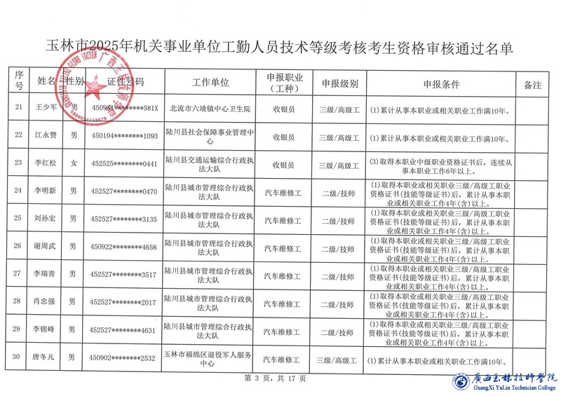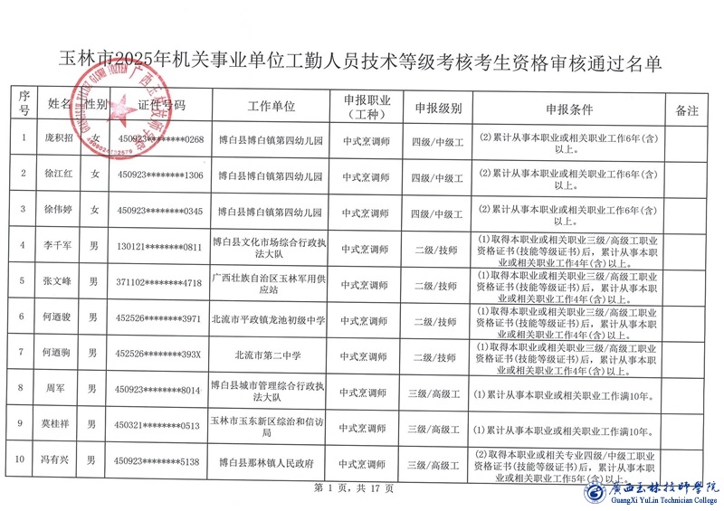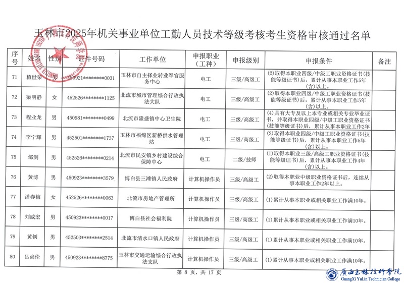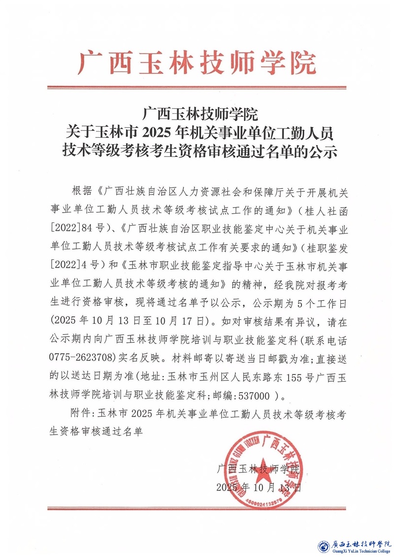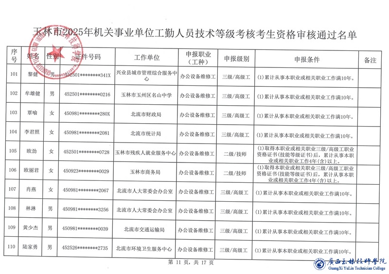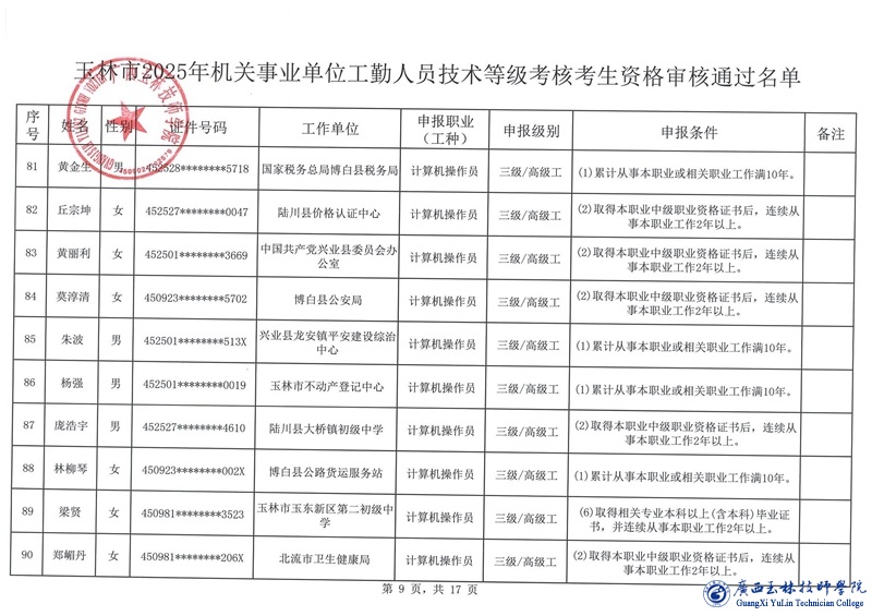 关于玉林市2025年机关事业单位工勤人员技术等级考核考生资格审核通过名单的公示