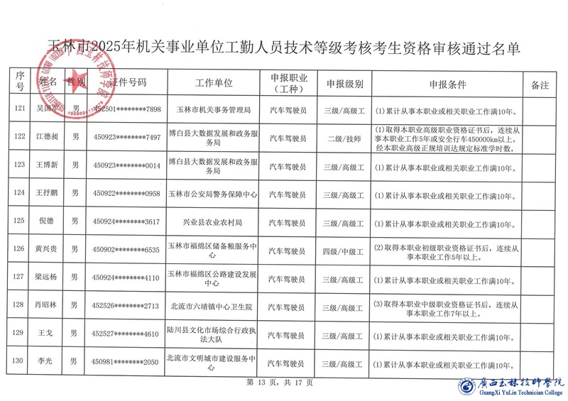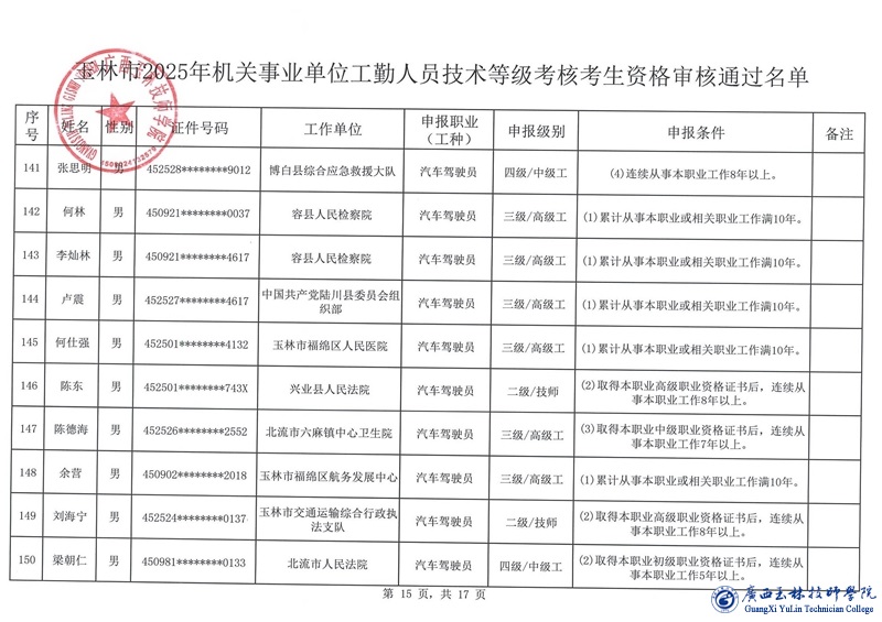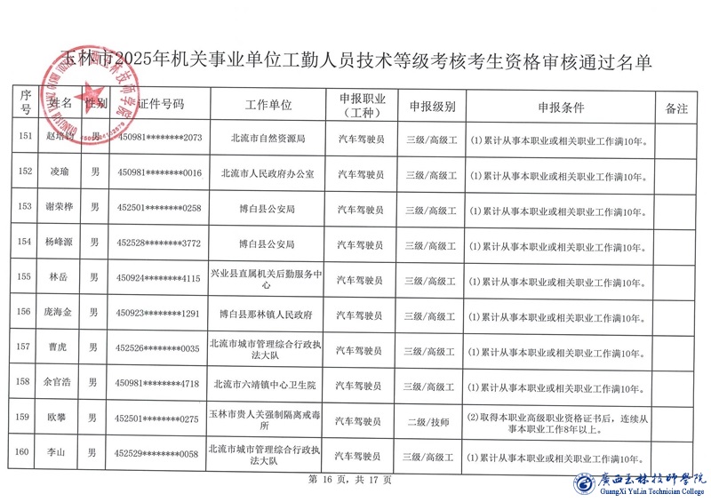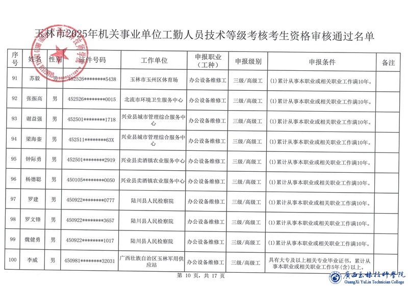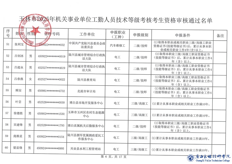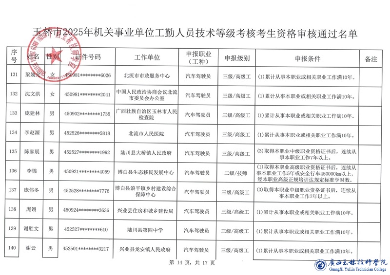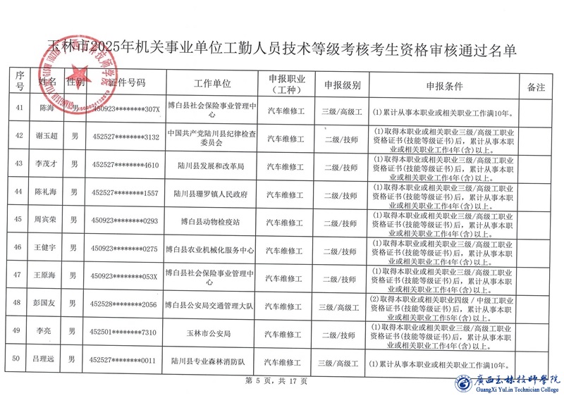 关于玉林市2025年机关事业单位工勤人员技术等级考核考生资格审核通过名单的公示