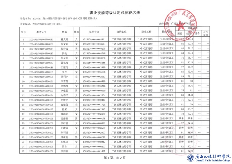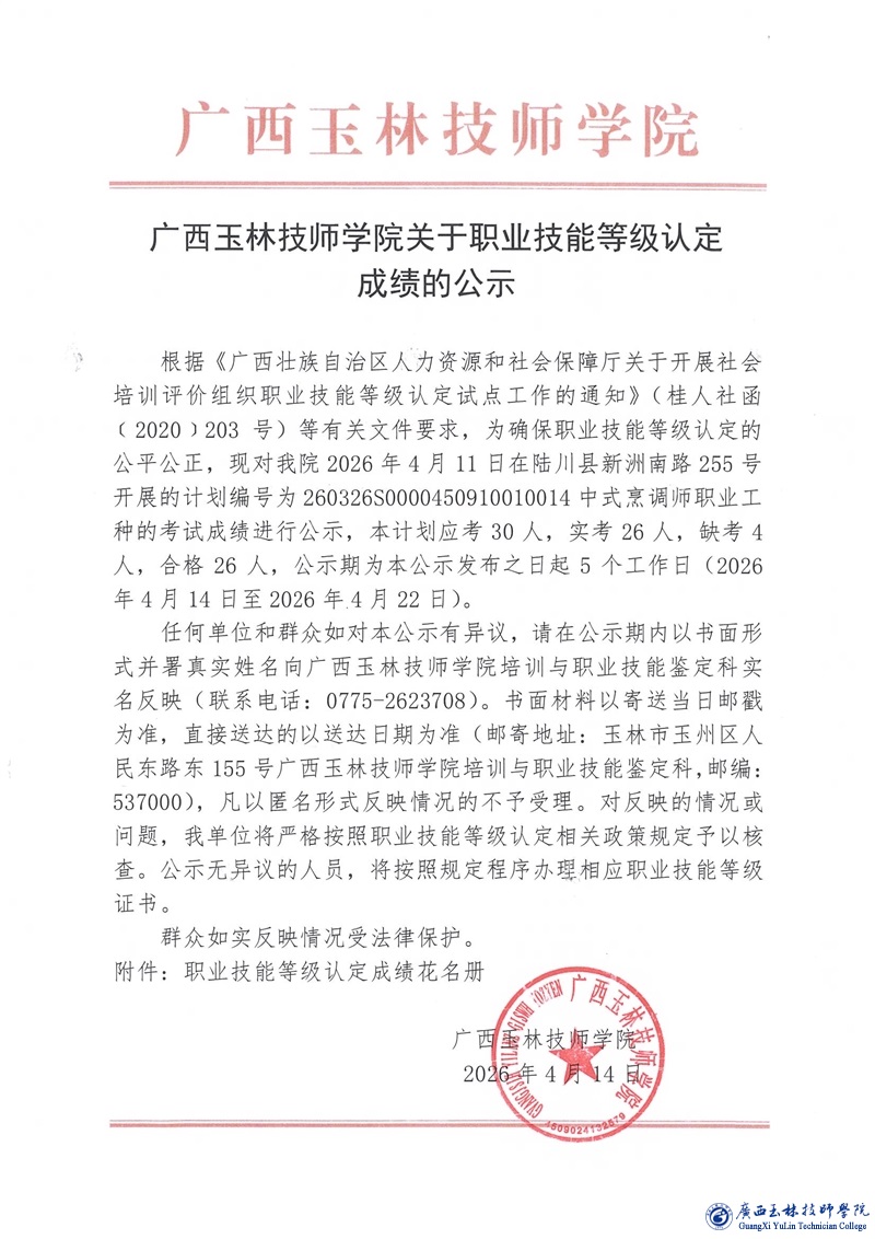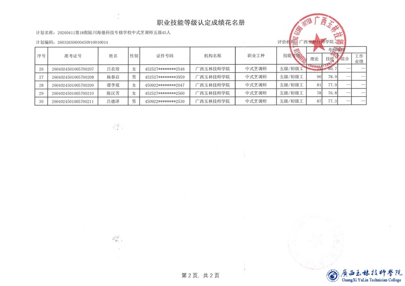 职业技能等级认定成绩公示(计划编号:260326S0000450910010014)